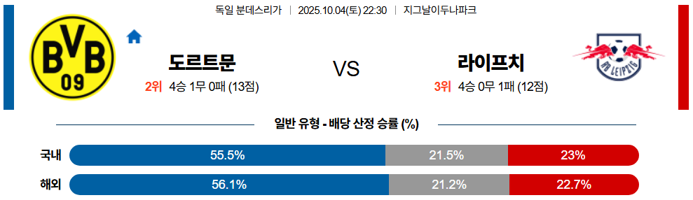 도르트문트는 챔스와 리그를 병행하며 체력 소모가 극심한 상태고, 라이프치히는 빠른 전환 공격과 측면 침투로 시즌 초반 강한 화력을 보여주고 있다.