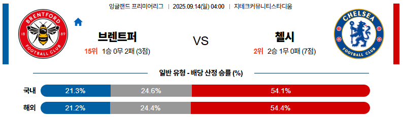 2025년 9월 14일 새벽 4시, 프리미어리그에서 브렌트퍼드와 첼시가 맞대결을 펼친다. 브렌트퍼드는 홈 이점을 노리지만, 전력과 전술적 완성도에서 첼시가 한층 우위에 있다.