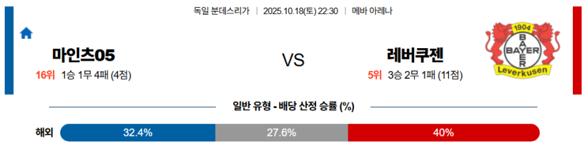 | 언더/오버 | 오버 (2.5) | • 레버쿠젠의 공격 효율 및 마인츠의 수비 불안 요소 반영 |
