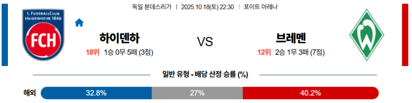 이 경기는 브레멘의 빠른 전환과 전방 압박이 하이덴하임의 조직적 허점을 파고들며, 원정에서도 완승을 거둘 가능성이 높다.