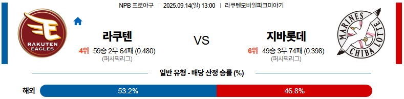 2025년 9월 14일 13시, NPB에서 라쿠텐 골든이글스와 치바 롯데 마린스가 맞붙는다.