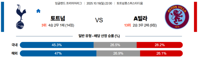 | 언더/오버 | 오버 (2.5) | • 토트넘의 공격 리듬 및 빌라의 수비 불안 |