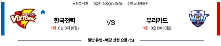 2025년 10월 20일 V-리그 남자부, 한국전력과 우리카드의 맞대결이 펼쳐진다.