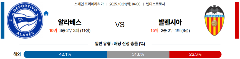 | 언더/오버 | 오버 (2.5) | • 알라베스의 효율적 공격 및 발렌시아의 수비 불안 |