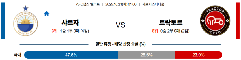 이 경기는 알 샤르자의 전술적 속도와 전환 타이밍이 트락토르를 압도할 것이다.