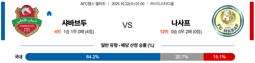 | 승패 예측 | 알 샤바브두 승 | • 전술 완성도와 홈 이점 우위 |