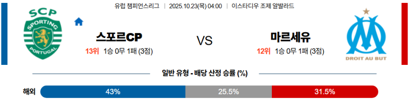 | 언더/오버 | 오버 (2.5) | • 스포르팅의 공격 효율과 마르세유 수비 불안정 반영 |