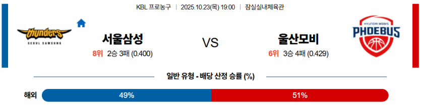 | 언더/오버 | 오버 (152.5) | • 삼성의 수비 불안 및 모비스의 빠른 트랜지션 반영 |