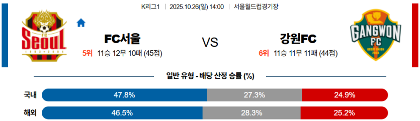 | 핸디캡 예측 | 강원 플핸 승 (+0.5) | 무승부 유력 시 언더독 강원이 유리 |