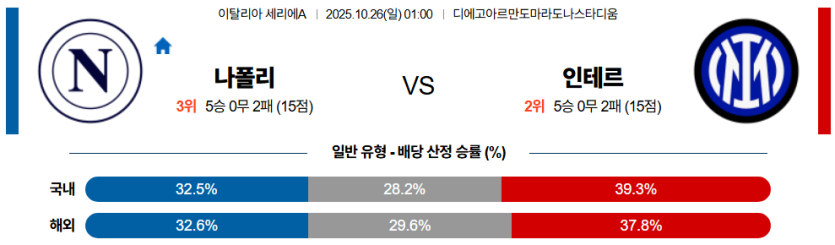 | 언더/오버 | 언더 (2.5) | • 인터 밀란의 실리적 경기 운영 및 나폴리의 공격 비효율 반영 |