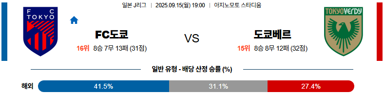 2025년 9월 15일 19시, J리그 1에서 FC 도쿄와 도쿄 베르디가 도쿄 더비를 치른다.