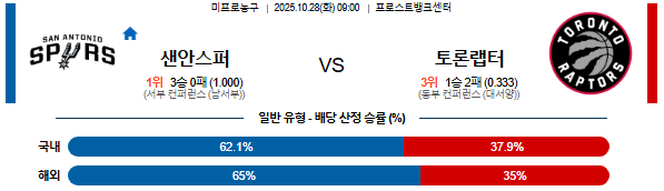 | 언더/오버 | 언더 (233.5) | • 토론토의 공격 정체 및 샌안토니오의 수비력 반영 |