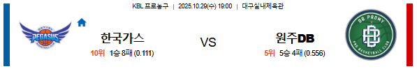 한국가스공사는 퍼킨스 효과에도 불구하고, 직전 승리가 상대 SK의 전력 누수가 컸다는 점을 감안하면 DB의 높이와 조직력을 상대로는 고전할 가능성이 높다.