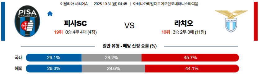 결국 라치오가 초반부터 **높은 라인 압박**으로 피사의 빌드업을 차단하고, 수비 라인 붕괴가 잦은 피사는 **후반 체력 저하**까지 겹치며 **대량 실점 위험**이 커질 것입니다.
