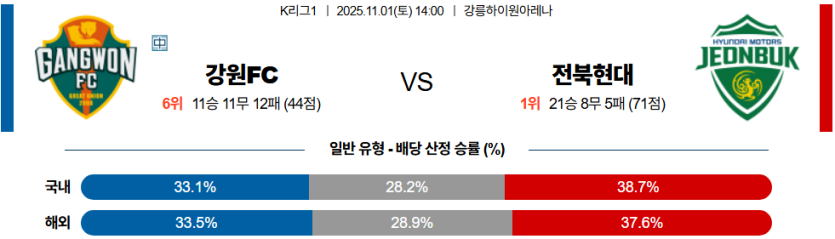 강원 승리가 가장 유력하며, 전북의 마무리 루트 단절을 감안해 **언더**를 추천한다.