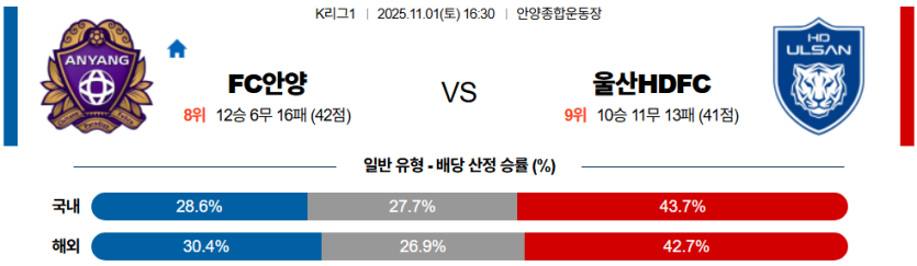 스포팡의 분석으로는 FC 안양이 모따를 축으로 한 완성형 공격 구조를 바탕으로 울산의 조직력 불안과 공중볼 리스크를 공략하며 홈에서 승리를 가져갈 것이다.