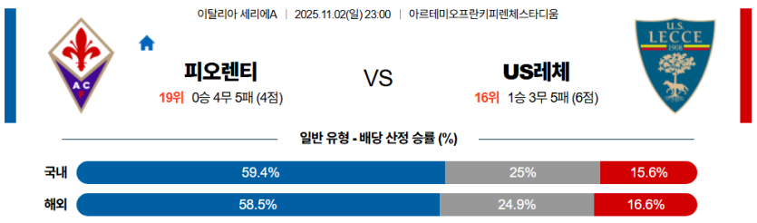 | 언더/오버 | 오버 (2.5) | • 피오렌티나의 공격 효율과 레체의 수비 밸런스 붕괴 반영 |