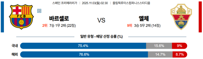 바르셀로나 승리가 가장 유력하며, 공격 효율과 엘체 수비의 붕괴 가능성을 감안해 **오버**를 강력히 추천한다.