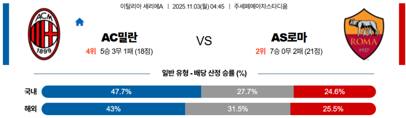 | 핸디캡 예측 | AC밀란 마핸 승 (-0.5) | • 로마 수비 라인 포지셔닝 불안 및 간격 붕괴 예상 |