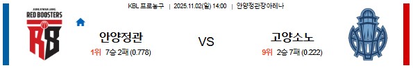 안양 정관장이 완성형 스크린 리딩 공격 시스템과 김종규의 인사이드/외곽 연계를 바탕으로 고양 소노를 제압할 것이다.