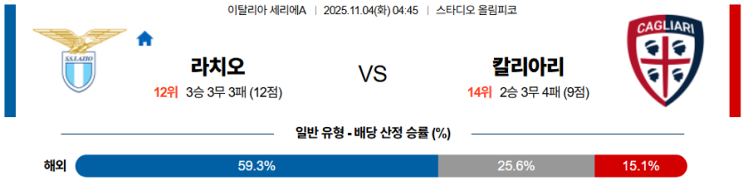 | 언더/오버 | 오버 (2.5) | • 라치오의 공격 효율 및 칼리아리 수비 불안 노출 반영 |