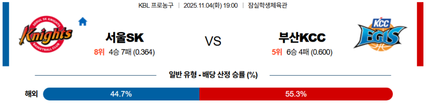 | 언더/오버 | 오버 (150.5) | • KCC의 높은 공격 효율과 트랜지션 리듬 예상 |