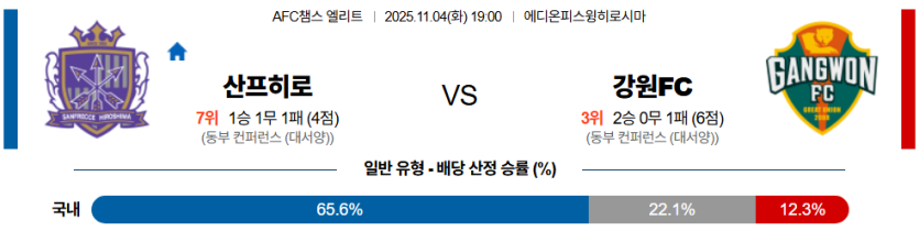 히로시마 승리가 가장 유력하며, 강원의 공격 효율 저하를 감안해 **언더**를 추천한다.