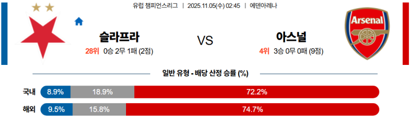 아스널은 **높은 점유율**을 유지하며 경기 리듬을 완전히 장악할 것이며, 슬라비아가 하프라인 근처에서 압박 실패가 나오면 곧바로 실점으로 이어질 **높은 리스크**를 안고 있습니다.