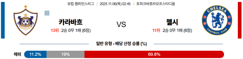 첼시 승리가 가장 유력하며, 공격 효율과 카라바흐 수비의 리스크를 감안해 **오버**를 추천한다.