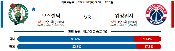 | 승패 예측 | 보스턴 승 | • 워싱턴 상대 8연승 상성 우위 및 홈 강세 |