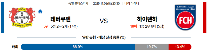| 언더/오버 | 오버 (2.5) | • 레버쿠젠의 공격 효율 및 하이덴하임 수비 리스크 반영 |
