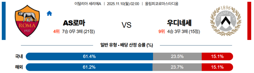 우디네세는 전환 시 라인 붕괴 문제가 반복되어 **로마의 공격 템포**를 견디기 어려울 것이며, **체력 저하가 시작되는 후반**에는 실점으로 직결되는 위험한 장면이 잦아질 것입니다.