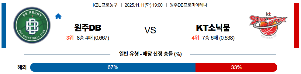 2025년 11월 11일 대한민국 KBL, 원주 DB와 수원 KT 소닉붐의 맞대결이 펼쳐진다.