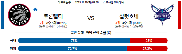 토론토는 배럿-퍼틀-반스가 고른 활약을 보이며 샬럿의 불안정한 외곽 수비와 리바운드 약세를 공략한다.