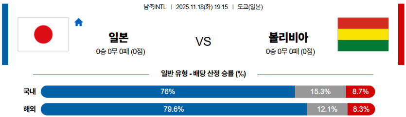 | 언더/오버 | 오버 (2.5) | • 일본의 높은 득점 기대값과 볼리비아의 수비 취약점 반영 |