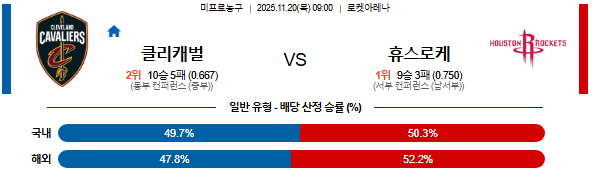 | 핸디캡 예측 | 휴스턴 플핸 승 (+1.0) | • 클리블랜드의 주축 가드 부재로 인한 전력 약화 |
