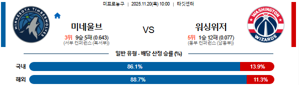 | 핸디캡 예측 | 미네소타 마핸 승 (-15.5) | • 워싱턴의 11연패 수비 붕괴 및 후반 집중력 저하 공략 |