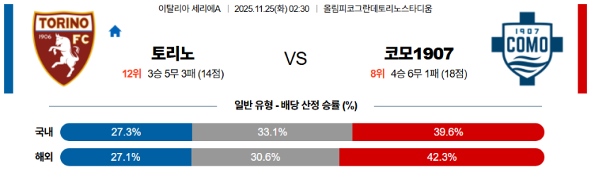 | 언더/오버 | 오버 (2.5) | • 토리노의 수비 전환 약점과 코모의 높은 공격 효율 반영 |