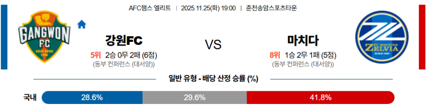 스포팡의 분석으로는 강원이 **완성도 높은 하프스페이스 공략 패턴**과 **홈 이점**을 활용해 마치다의 수비 약점을 파고들며 **승리**를 가져갈 것이다.