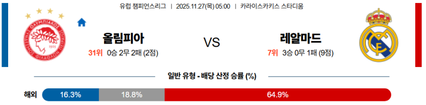 | 핸디캡 예측 | 레알 마드리드 마핸 승 (-1.5) | • 올림피아코스의 수비 붕괴와 레알의 결정력 차이 |