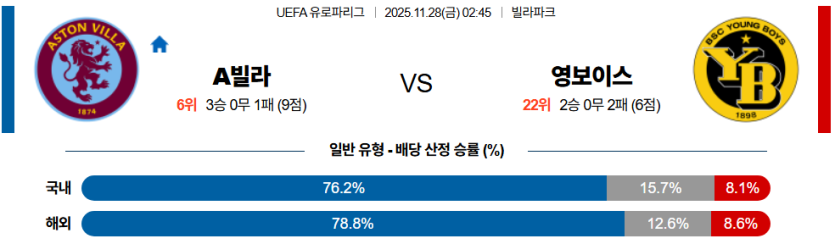 | 언더/오버 | 오버 (2.5) | • 아스톤빌라의 맹공과 영보이즈의 수비 불안정성 반영 |