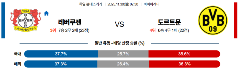 도르트문트는 공격적인 운영으로 맞불을 놓겠지만, **수비 뒷공간에 대한 리스크**를 극복하지 못하고 레버쿠젠의 카운터 어택에 실점을 허용할 가능성이 큽니다.