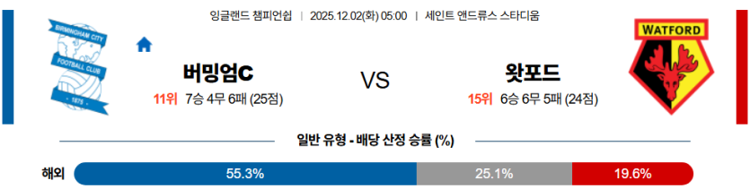 버밍엄시티 마핸 승이 유력하며, 왓포드의 수비 불안을 고려해 **오버**를 강력히 추천한다.