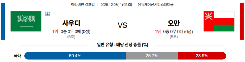 스포팡의 분석으로는 사우디아라비아가 **알 셰흐리의 중거리 한 방과 조직적인 압박**을 앞세워, 수비 리커버리에 약점을 보이는 오만을 상대로 **승리**를 거둘 것이다.