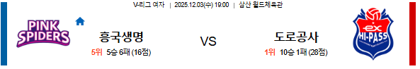 2025년 12월 3일 19:00 V-리그 여자부, 흥국생명과 한국도로공사의 맞대결이 펼쳐진다.