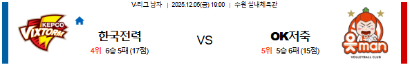 이 경기는 서브 우위와 다양한 공격 옵션을 갖춘 한국전력이 홈에서 주도권을 잡고 승리할 가능성이 높다.