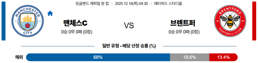 브렌트퍼드는 역습을 노리겠지만, 맨시티의 압박에 고전하며 **수비 조직력이 붕괴**될 가능성이 큽니다.