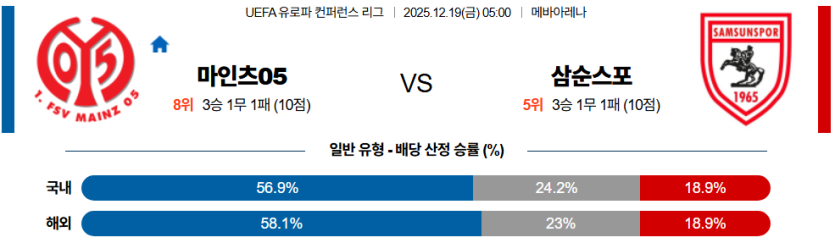 | 승패 예측 | 마인츠 승 | • 홈 강세, 전력 우위, 상대 피로 누적 |