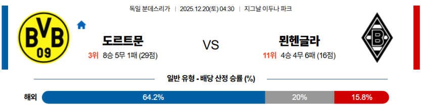 | 핸디캡 예측 | 도르트문트 마핸 승 (-1.5) | • 글라트바흐의 트랩 붕괴와 대량 실점 예상 |