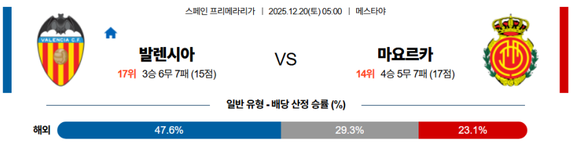 마요르카는 전반에는 버티겠지만, 시간이 갈수록 수비 라인 간격이 벌어지며 발렌시아의 **측면 공략**에 무너질 가능성이 큽니다.